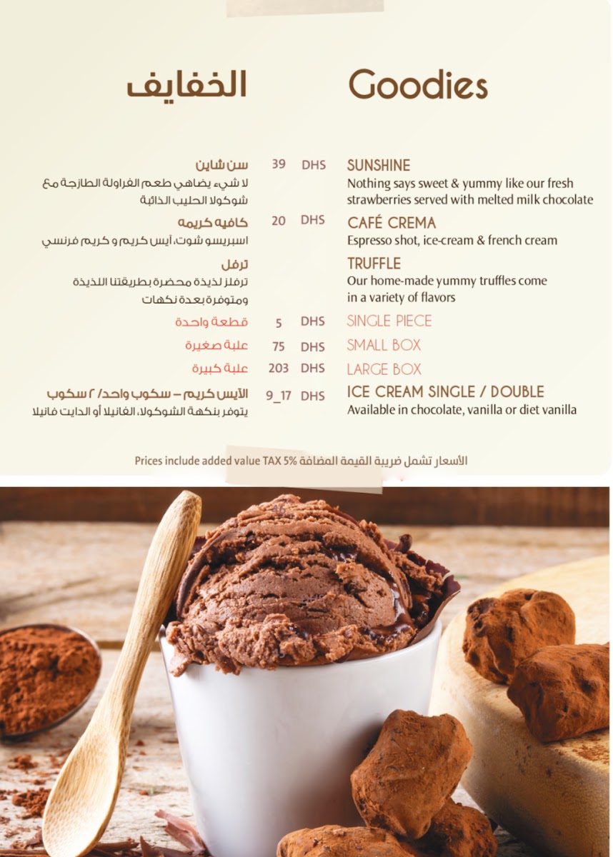Cream & Honey Kalba is renowned for its sweet treats. Indulge in their Pistachio Cake, a heavenly creation adorned with crunchy pistachio nuts and drizzled with luscious milk chocolate, all for just AED 27.00. If you have a penchant for rich chocolate goodness, don’t miss their Chocolate Brownie, served with a generous scoop of ice cream and drizzles of both milk and white chocolate – a dessert lover's paradise at AED 27.00!